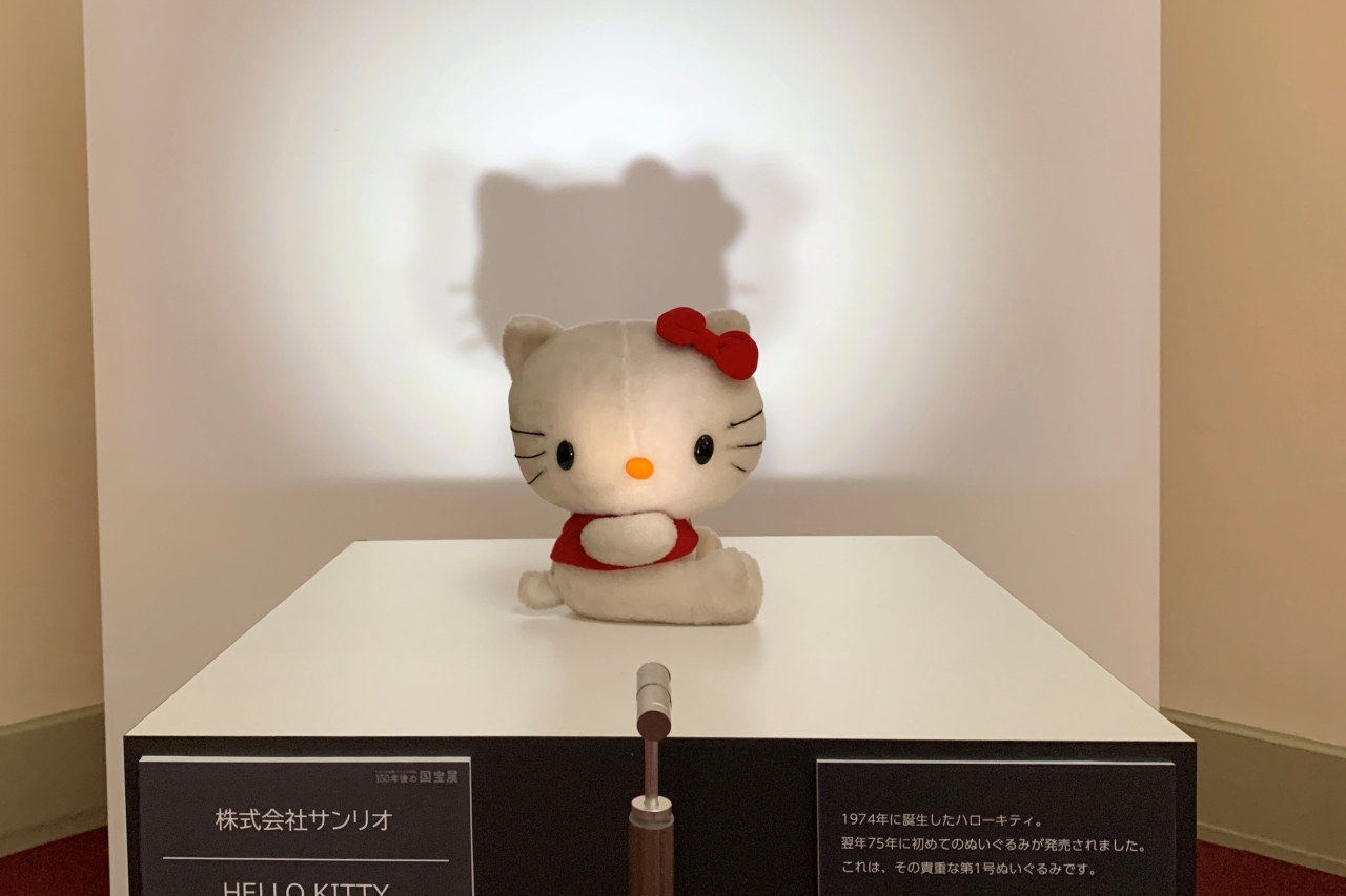 表情を伝える口が描かれていないからこそ、見ている人が自由に感情を乗せることができるハローキティ。人々の心に寄り添う存在として、これからも世界中をつないでいくことでしょう。展示されているのは、1975年発売の貴重な第1号ぬいぐるみです。