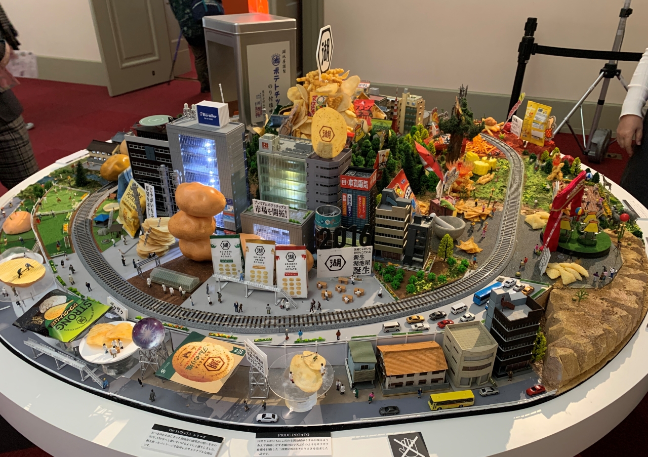 展示では、湖池屋のポテトチップスの歴史をジオラマで再現しています。ジオラマ内を走る「ポテト列車」にスマホを設置することで、「ヒーヒーおばあちゃん」や「ポリンキー」たちに見守られながらの楽しいポテトチップスの旅を動画撮影することができますので、ぜひ試してみてください。