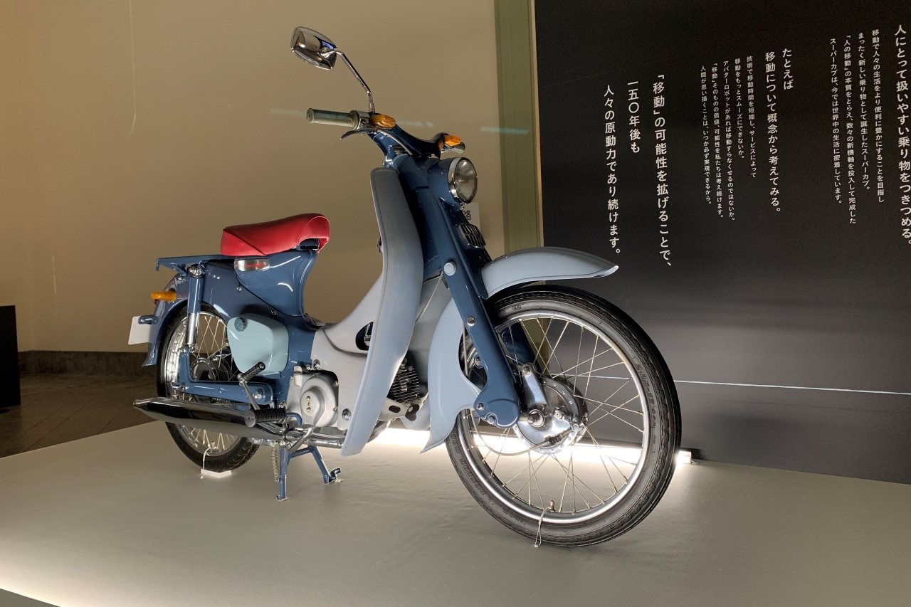 生産累計1億台以上。熱烈なファンが多く、世界で一番売れたバイクとして知られるスーパーカブの誕生は1958年ですが、展示されているのはまさに始まりの1台、1958年製の初代スーパーカブC100となっています。
