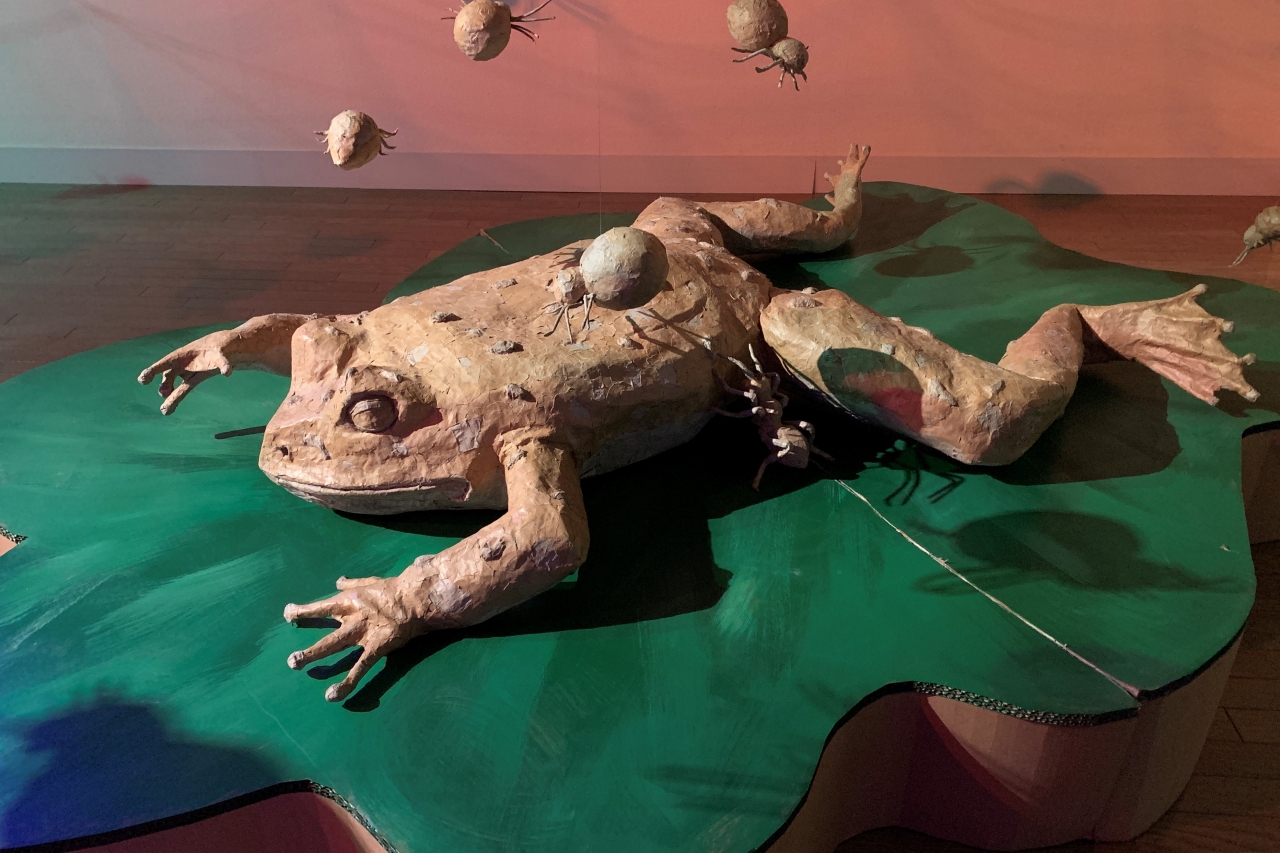 カエルは約2メートルと非常に大きいですが、カエルが巨大化したのではなく、鑑賞者が小さくなったイメージで鑑賞してほしいとのこと。上部にはクモの巣が張り巡らされ、無数のクモたちがカエルを監視するように見下ろしています。