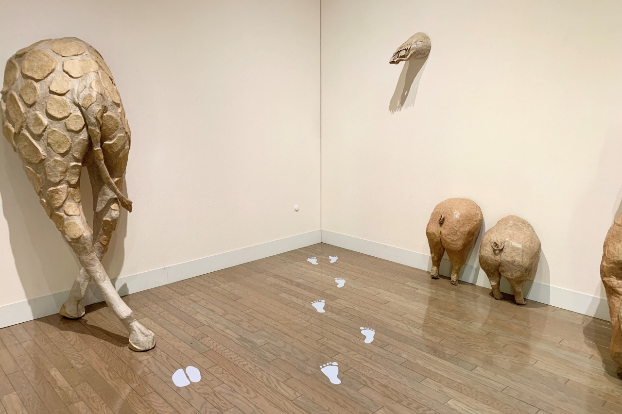 会場を進んでまず目に入るのは「おしりの物語」の展示。ワニやブタ、キリンなどさまざまな生き物たちのお尻が壁から突き出ているように見えるユニークなエリアです。