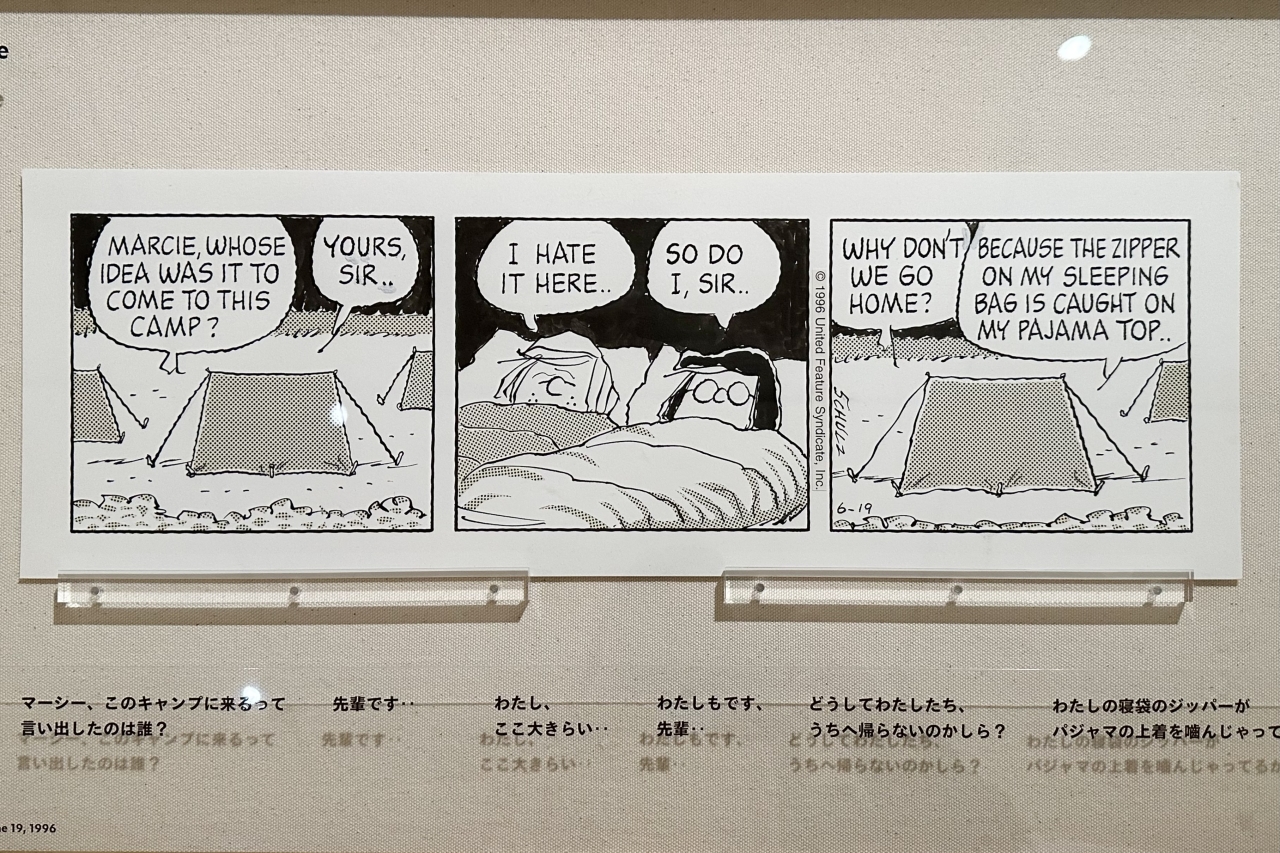 本展では原画以外に、シュルツが写ったさまざまな旅行先での写真も資料として展示されており、その旅の経験が作品に影響を与えていただろうことが伺えました。コミックに登場する、旅先で家に帰りたがるキャラクターたちの言葉は、もしかしたらシュルツの心の声なのかもしれません。