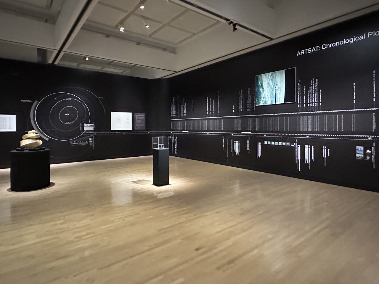 最初の展示空間で来場者が出会うのは、ARTSATプロジェクト(久保田晃弘|平川紀道|稲福孝信)による《ARTSAT Chronicle》(2026)です。これは、2014年に打ち上げられた世界初の芸術衛星「INVADER」と深宇宙彫刻《DESPATCH》という、芸術と工学のジャンルを横断した「宇宙と地上を結ぶメディア」の取り組みを、模型や年表などで改めて振り返るものです。