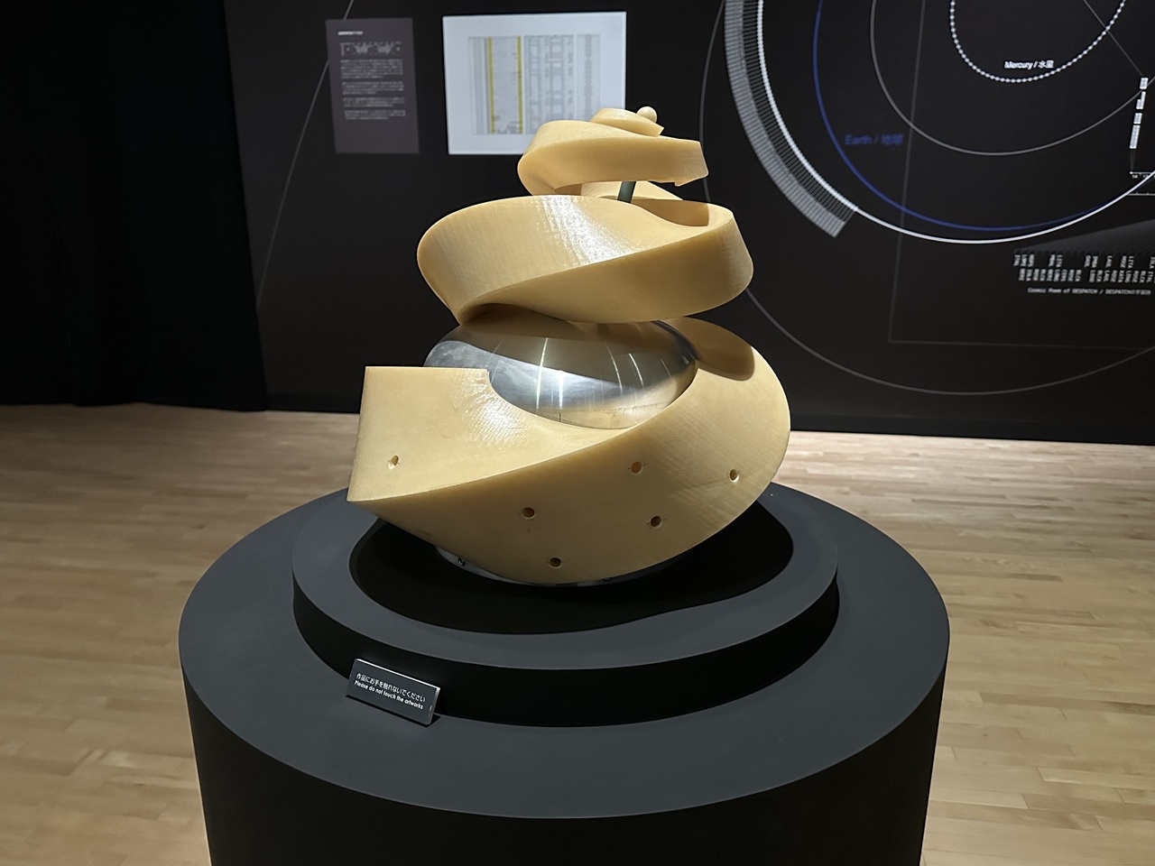 一方の深宇宙彫刻《DESPATCH》は、3Dプリンタで制作された螺旋状の彫刻を携えた、芸術家の分身たる宇宙機。半永久的に太陽の周りを回り続ける「世界で最も遠い芸術作品」です。そのミッションの一つは、宇宙生成詩(温度などの各種センサーデータから搭載プログラムが生成)の送信でした。信号が微弱になるほどに、国境を超えたアマチュア無線家たちの協力が不可欠となった受信プロセスは、送信され、失われ、断片として再構成された出来事の記録であり、宇宙と地上を見えない糸で結ぶ「巨大な社会的データ彫刻」そのものです。会場では、受信した宇宙生成詩とともに、本展会期中の《DESPATCH》や各惑星の位置を表示しています。