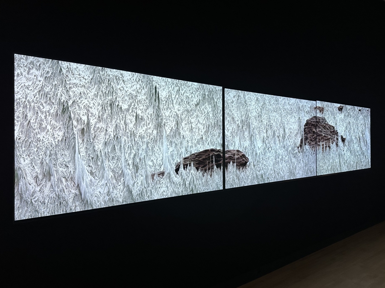 映像の視覚体験の新たな可能性を開いた古澤龍の《Mid Tide #3》(2024)は、海岸を定点カメラで約3時間半にわたって観測した映像を素材に、時間と空間の関係を組み替えた作品です。映像を「連続する静止画」として順番に連ねた立体だと考えた場合、通常の映像再生は、この立体の一断面を前から後ろへ連続的に動かすプロセスです。しかし本作では、その断面を斜断、あるいは旋回させることで、単線的な時間の流れから、そして固定された観測点からも逸脱していきます。圧縮と伸長、順再生と逆再生が混在するカオスな時空間は、「観測」という行為そのものの認識を揺さぶります。