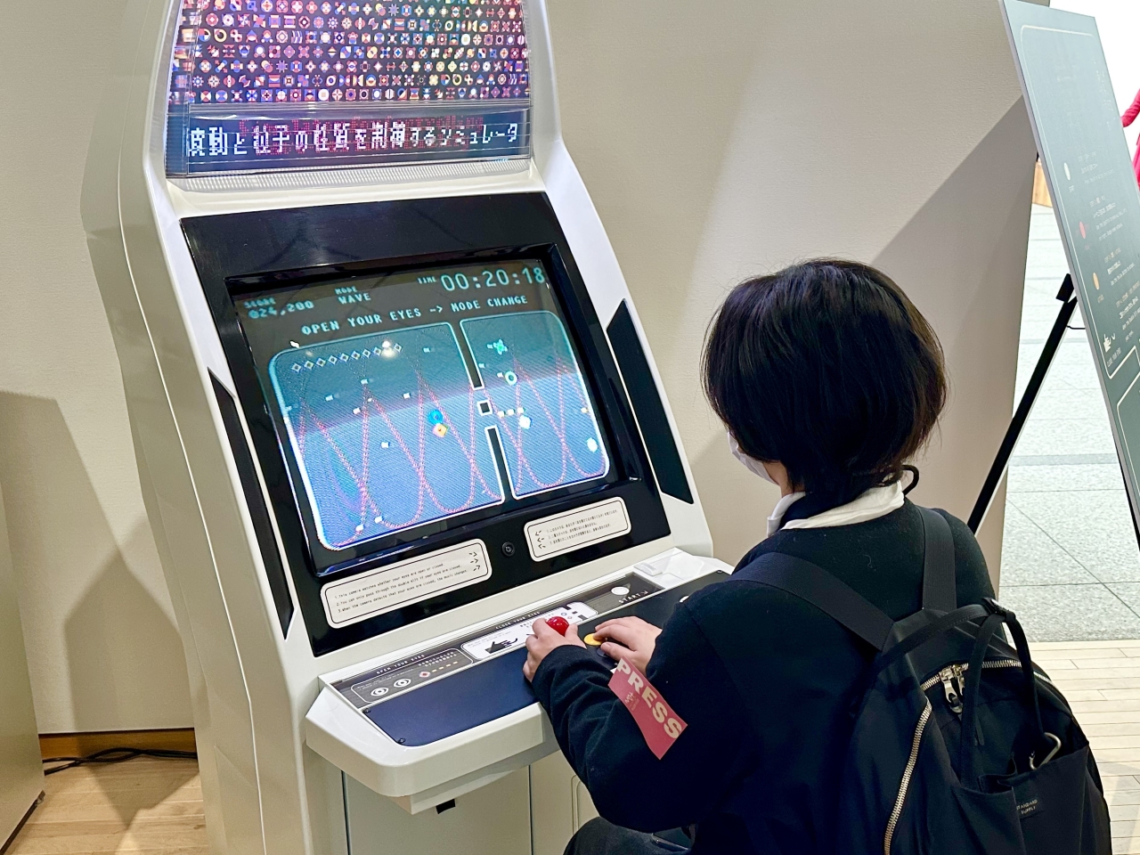 たとえば、江渡浩一郎+アラレグミによる《波動と粒子の性質を制御するシミュレータ》(2025)は、その名のとおり、量子力学の特性である粒と波という二重の性質を行き来する様子を、直感的に体験できるシューティングゲームです。具体的には、目を閉じる=観測を止めることで自機の存在が確率的に広がり、障害物に当たらなくなる無敵モードに移行するというユニークなもの。