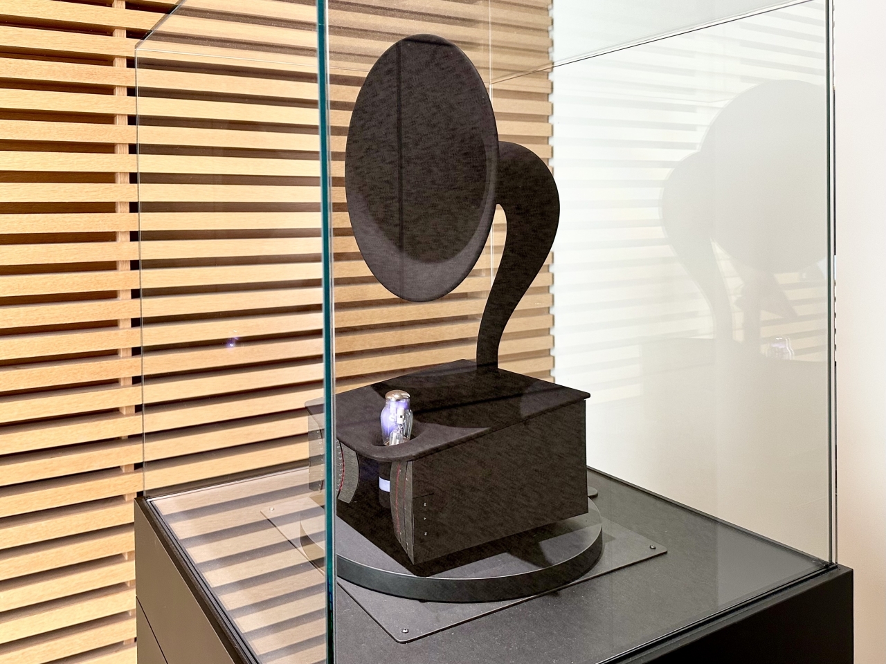 ブラックホールの時空の歪みを模した漆黒のホーンが周囲の音声を集音し、0.1㎜サイズの理論上の人工ブラックホールに、10那由多バイトという途方もない情報を記録する架空の技術を搭載。現在も会場の音を刻々と記録し続けており、将来的には「人類が初めてブラックホールに保存する情報」として、約1,500光年先にある実在のブラックホールに送信することを目指しているといいます。