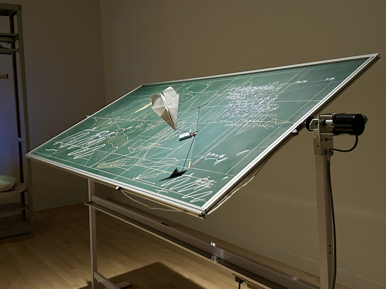 中でも印象的だったのは、「回転の対称性」を扱った数式が記された黒板自体が回転し、そこを紙飛行機が魔法のようにすり抜けていく《すり抜ける紙飛行機》(2017)です。ミクロの粒子が波の性質を併せ持つ「二重性」や、その性質ゆえに粒子がエネルギーの壁を確率的に通り抜けてしまう「トンネル効果」。彼らはそうした非日常的な挙動をユーモラスに「曲解」することで、アートとサイエンスの境界をあいまいにし、新たなイメージを立ち上げています。