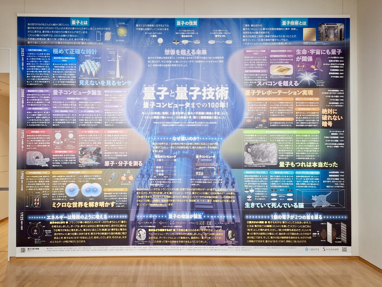 「量子のことはよくわからないから、ちゃんと展示を楽しめるか不安……」という方も心配はいりません。展示室の入り口には、「一家に1枚 量子と量子技術~量子コンピュータまでの100年!~」という大型のポスターが設置されています。これは文部科学省が毎年1枚ずつ発行している、科学技術の理解促進を目的とした学習資料を拡大したもの。先ほど挙げた「重ね合わせ」や「もつれ」といった量子の性質や、これまでの量子研究の発展の歴史について簡潔にまとめられています。