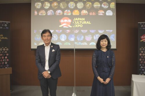 記者発表会では、都倉俊一文化庁長官と河村潤子日本芸術文化振興会理事長が登壇し、「バーチャル日本博」の概要説明や質疑応答に対応しました。