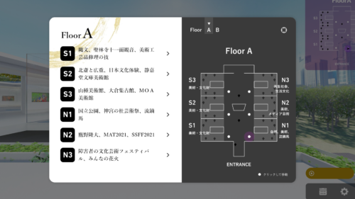 慣れないうちは、やや操作に戸惑うかもしれません。見たいコンテンツが決まっている場合は、画面右上に表示されるフロアマップをクリックして詳細を開き、各エリアの移動ポイントを押せばスムーズに移動できるでしょう。