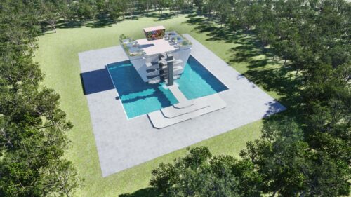 3DCGの自然と水に囲まれた白亜の仮想パビリオンが「バーチャル日本博」の舞台。高く青い空、遠くに富士山を望む開放的で美しい空間が広がっています。